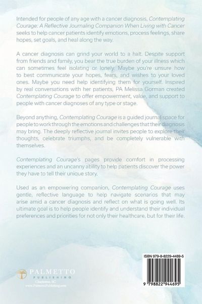 Intended for people of any age with a cancer diagnosis, Contemplating Courage: A Reflective Journaling Companion When Living with Cancer seeks to help people with cancer identify emotions, process feelings, share hopes, set goals, and heal along the way. A cancer diagnosis can grind your world to a halt. Despite support from friends and family, you bear the true burden of your illness which can sometimes feel isolating or lonely. Maybe you're unsure how to best communicate your hopes, fears, and wishes to your loved ones. Maybe you need help identifying them for yourself. Inspired by real conversations with her patients, PA Melissa Gorman created Contemplating Courage to offer empowerment, value, and support to people with cancer diagnoses of any type or stage. Beyond anything, Contemplating Courage is a guided journal space for people to work through the emotions and challenges that their diagnosis may bring. This deeply reflective journal invites you to explore your thoughts, celebrate triumphs, and be completely vulnerable. Contemplating Courage's pages provide comfort in processing experiences and an uncanny ability to help people discover the power they have to tell their unique story. Used as an empowering companion, Contemplating Courage uses gentle, reflective language to help navigate scenarios that may arise amid a cancer diagnosis and also reflect on what is going well. Its ultimate goal is to help people identify and understand their individual preferences and priorities for not only their healthcare, but for their life.