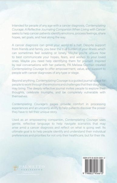 Intended for people of any age with a cancer diagnosis, Contemplating Courage: A Reflective Journaling Companion When Living with Cancer seeks to help people with cancer identify emotions, process feelings, share hopes, set goals, and heal along the way. A cancer diagnosis can grind your world to a halt. Despite support from friends and family, you bear the true burden of your illness which can sometimes feel isolating or lonely. Maybe you're unsure how to best communicate your hopes, fears, and wishes to your loved ones. Maybe you need help identifying them for yourself. Inspired by real conversations with her patients, PA Melissa Gorman created Contemplating Courage to offer empowerment, value, and support to people with cancer diagnoses of any type or stage. Beyond anything, Contemplating Courage is a guided journal space for people to work through the emotions and challenges that their diagnosis may bring. This deeply reflective journal invites you to explore your thoughts, celebrate triumphs, and be completely vulnerable. Contemplating Courage's pages provide comfort in processing experiences and an uncanny ability to help people discover the power they have to tell their unique story. Used as an empowering companion, Contemplating Courage uses gentle, reflective language to help navigate scenarios that may arise amid a cancer diagnosis and also reflect on what is going well. Its ultimate goal is to help people identify and understand their individual preferences and priorities for not only their healthcare, but for their life.