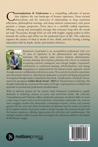 Contemplations & Undertones is a compelling collection of poems that explores the vast landscape of human experience.From societal observations and the intricacies of relationships to deep emotional reflections, philosophical musings, and sharp satirical commentary, each poem presents a unique perspective. Every piece is a carefully crafted expression, offering a strong and meaningful message that resonates long after the words are read. The poems, though brief, are rich with insight, urging readers to delve beneath the surface and reflect on the profound layers of life. This collection captures the essence of what it means to live, think, and feel, leaving a lasting impression with its depth, clarity, and timeless relevance.
