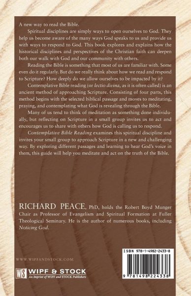 A new way to read the Bible. Spiritual disciplines are simply ways to open ourselves to God. They help us become aware of the many ways God speaks to us and provide us with ways to respond to God. This book explores and explains how the historical disciplines and perspectives of the Christian faith can deepen both our walk with God and our community with others. Reading the Bible is something that most of us are familiar with. Some even do it regularly. But do we really think about how we read and respond to Scripture? How deeply do we allow ourselves to be impacted by it? Contemplative Bible reading (or lectio divina, as it is often called) is an ancient method of approaching Scripture. Consisting of four parts, this method begins with the selected biblical passage and moves to meditating, praying, and contemplating what God is revealing through the Bible. Many of us tend to think of meditation as something done individually, but reflecting on Scripture in a small group invites us to act and encourages us to share with others how God is calling us to respond. Contemplative Bible Reading examines this spiritual discipline and invites your small group to approach Scripture in a new and challenging way. By exploring different passages and learning to hear God's voice in them, this guide will help you meditate and act on the truth of the Bible.