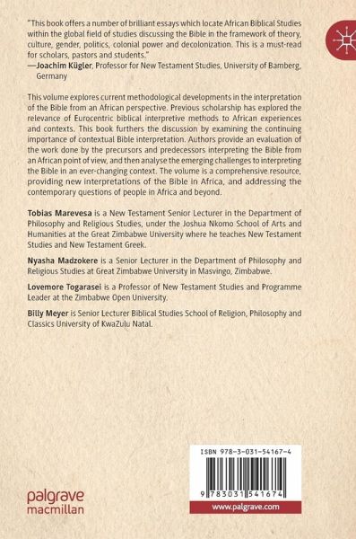 Tobias Marevesa is a New Testament Senior Lecturer in the Department of Philosophy and Religious Studies, under the Joshua Nkomo School of Arts and Humanities at the Great Zimbabwe University where he teaches New Testament Studies and New Testament Greek. Nyasha Madzokere is a Senior Lecturer in the Department of Philosophy and Religious Studies at Great Zimbabwe University in Masvingo, Zimbabwe Lovemore Togarasei is a Professor of New Testament Studies and Programme Leader at the Zimbabwe Open University Billy Meyer is Senior Lecturer Biblical Studies School of Religion, Philosophy and Classics University of KwaZulu Natal