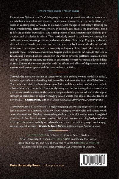 Contemporary African Screen Worlds brings together a new generation of African screen media scholars who explore and theorize the dynamic, interactive screen worlds that have arisen in contemporary Africa due to dramatic global changes in technology. Drawing on long-term fieldwork, extensive interviews, and specific case studies, the contributors bring to life the complex materialities and entanglements of film spectatorship, fandom, production, and circulation in Africa. They particularly attend to the interfaces among film audiences, actors, makers, platforms, and screens both small and large. Engaging with more than a dozen national contexts across the continent, the book reveals the diversity of African screen media practices and the creativity and agency of the people who passionately generate them, from film craftworkers in Nigeria and film students in Ghana to film fans in Rwanda and Burkina Faso. By focusing on the work of powerful platforms (such as Netflix and MTVShuga) and ordinary people (such as domestic workers watching Nollywood films in rural Kenya), this volume grapples with the effects and affects of digitization, mobile screens, media convergence, and the televisual turn in Africa. Contributors. Moradewun Adejunmobi, Añulika Agina, Alexander Bud, Lindiwe Dovey, Femi Eromosele, Pier Paolo Frassinelli, Alexandra Grieve, Jonathan Haynes, Joe Jackson, Alessandro Jedlowski, Dennis-Brook Prince Lotsu, Alison MacAulay, Elastus Mambwe, Asteway M. Woldemichael, Nedine Moonsamy, Elizabeth Olayiwola, Temitayo Olofinlua, Rashida Resario, Estrella Sendra, Robin Steedman, Michael W. Thomas, Stefanie Van de Peer, Solomon Waliaula