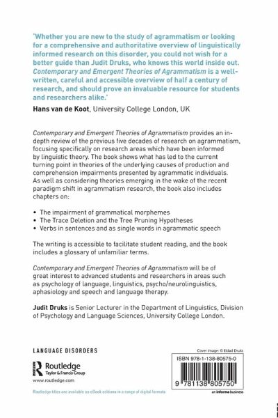 Contemporary and Emergent Theories of Agrammatism provides an in-depth review of the previous five decades of research on agrammatism focusing specifically on work which has been informed by linguistic theory. The final chapters reflect the recent turning point in the conceptualization of the underlying causes of the impairments agrammatic individuals present with. The book includes chapters on impairments to grammatical morphemes the tree pruning and trace deletion hypotheses verb deficits in sentences, and as single words generalized minimality adaptation theory and slow syntax the involvement of discourse To facilitate student reading the writing is clear and accessible, and the book includes a glossary of unfamiliar terms. Contemporary and Emergent Theories of Agrammatism will be of great interest to advanced students and researchers in areas such as psychology of language, linguistics, neurolinguistics, aphasiology and speech and language therapy.