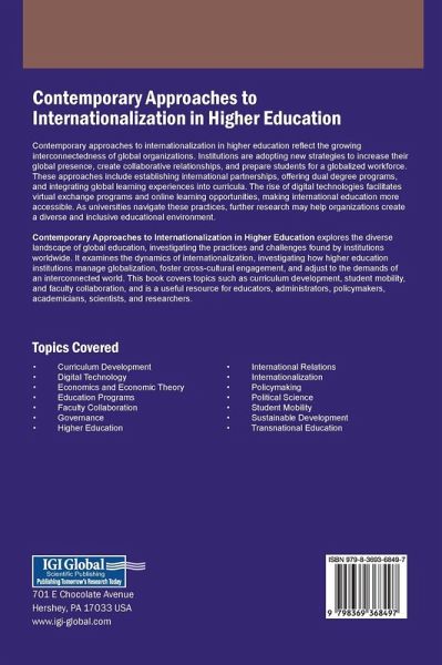 Contemporary approaches to internationalization in higher education reflect the growing interconnectedness of global organizations. Institutions are adopting new strategies to increase their global presence, create collaborative relationships, and prepare students for a globalized workforce. These approaches include establishing international partnerships, offering dual degree programs, and integrating global learning experiences into curricula. The rise of digital technologies facilitates virtual exchange programs and online learning opportunities, making international education more accessible. As universities navigate these practices, further research may help organizations create a diverse and inclusive educational environment. Contemporary Approaches to Internationalization in Higher Education explores the diverse landscape of global education, investigating the practices and challenges found by institutions worldwide. It examines the dynamics of internationalization, investigating how higher education institutions manage globalization, foster cross-cultural engagement, and adjust to the demands of an interconnected world. This book covers topics such as curriculum development, student mobility, and faculty collaboration, and is a useful resource for educators, administrators, policymakers, academicians, scientists, and researchers.