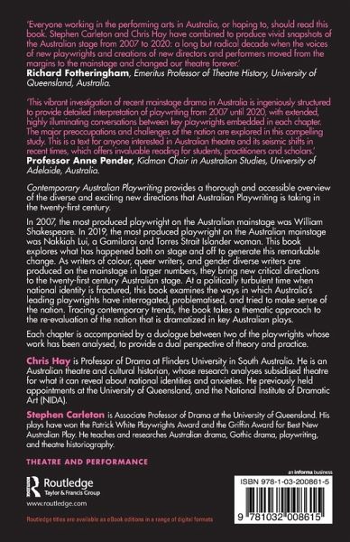 Chris Hay is Professor of Drama at Flinders University in South Australia. He is an Australian theatre and cultural historian, whose research analyses subsidised theatre for what it can reveal about national identities and anxieties. He previously held appointments at the University of Queensland, and the National Institute of Dramatic Art (NIDA). Stephen Carleton is Associate Professor of Drama at the University of Queensland. His plays have won the Patrick White Playwrights Award and the Griffin Award for Best New Australian Play. He teaches and researches Australian drama, Gothic drama, playwriting, and theatre historiography.