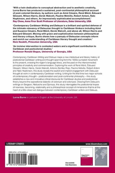 Contemporary Caribbean Writing and Deleuze maps a new intellectual and literary history of postcolonial Caribbean writing and thought spanning from the 1930s surrealist movement to the present, crossing the region's language blocs, and focused on the interconnected principles of creativity and commemoration. Exploring the work of René Ménil, Édouard Glissant, Wilson Harris, Derek Walcott, Antonio Benítez-Rojo, Pauline Melville, Robert Antoni and Nalo Hopkinson, this study reveals the explicit and implicit engagement with Deleuzian thought at work in contemporary Caribbean writing. Uniting for the first time two major schools of contemporary thought - postcolonialism and post-continental philosophy - this study establishes a new and innovative critical discourse for Caribbean studies and postcolonial theory beyond the oppositional dialectic of colonizer and colonized. Drawing from Deleuze's writings on Bergson, Nietzsche and Spinoza, this study interrogates the postcolonial tropes of newness, becoming, relationality and a philosophical concept of immanence that lie at the heart of a little-observed dialogue between contemporary Caribbean writers and Deleuze.