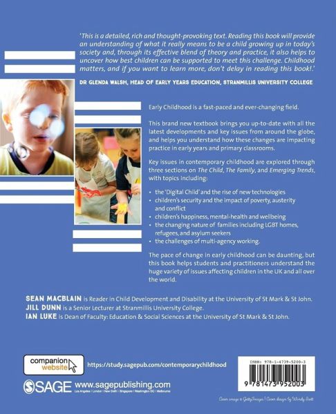 This brand new textbook brings you up to date with all the latest developments and keys issues from around the globe, and helps you understand how these changes are impacting on practice in early years and primary classrooms. Key issues in contemporary childhood are explored through three sections on The Child, The Family, and Emerging Trends, with topics including: the Digital Child and the rise of new technologies children s security and the impact of poverty, austerity and conflict children s happiness, mental-health and wellbeing the changing nature of families including LGBT homes,…mehr