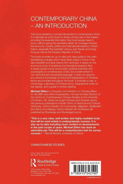 This book presents a concise introduction to contemporary China. It is intended as a first book for those coming new to the subject, providing the essential information that most people need to know, without going into excessive detail. Its coverage includes the economy, society, politics and international relations; China's history, especially the twentieth century; and Taiwan and Hong Kong as well as the People's Republic of China. The book provides an up-to-date and clear guide to the often bewildering changes which have taken place in China in the late twentieth and early twenty-first centuries. It draws on the enormous body of empirical and theoretical research that is being carried out by economists, political scientists and sociologists on contemporary China, but is itself written in non-technical and accessible language. It does not assume any previous knowledge of China and explanations of Chinese terms are provided throughout the book. It includes a map, a chronology, a glossary of Chinese terms, biographical notes on key figures, and a guide to further reading.