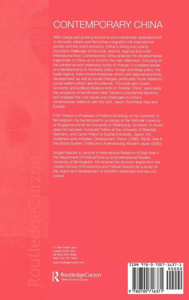 List of ContributorsPreface and AcknowledgementsIntroduction 1. Change in Contemporary China P. W. Preston and Jürgen HaackeChina: Economic and Regional Change 2. Monetary Policy and Structural Changes in the Financial Sector in China David Dickinson 3. China's Foreign Exchange Policy in a Time of Change Zhang Zhichao 4. The Reform of China's Foreign Trade Regime in the First Decade of the New Millennium Tong Jiadong 5. State-Owned Enterprises: A Review of Development Dynamics, Contemporary Problems and the Shape of the Future P. W. Preston and Xing Aifen 6. Regional Economic Development Strategies in China Hsiao-hung Nancy Chen 7. Social Welfare Reform in China: The Impact of Globalisation Guan Xinping 8. Behind the Virtual Wall: The People's Republic of China and the Internet Gudrun Wacker 9. Challenges an Opportunities for Unification after Taiwan's 2000 Presidential Elections Christopher R. Hughes 10. Rational Authoritarianism and Chinese Economic Reform Zhao Chenggen 11. (Post-) Asian 'Crisis' and 'Greater China': On the Bursting of the 'Bubbles' and Hi-Tech (Re-)Imaginations Ngai-Ling Sum China: Developments in External Relations 12. China and the United States: An Uneasy and Unstable Relationship Jürgen Haacke 13. Re-assessing the Sino-Japanese Axis in the New Strategic Triangle: A Case for Peaceful Co-existence? Caroline Rose 14. China and ASEAN: Setting Parameters for Future Co-operation Jürgen Haacke 15. The Politics of the European Union's Relations with China Paul LimChina: Conclusions 16. China at the Start of the New Millennium Jürgen Haacke and P. W. Preston Index