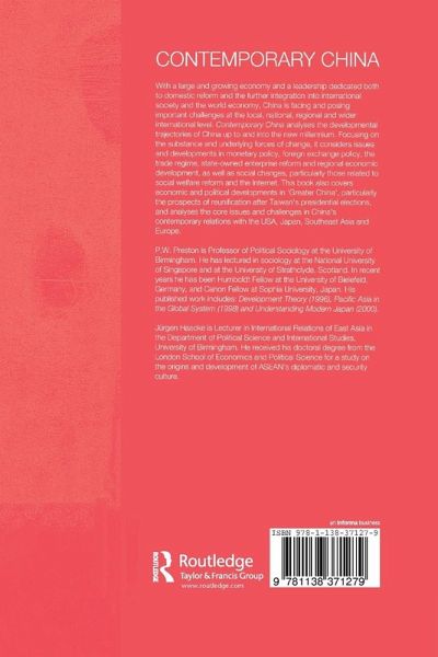 List of ContributorsPreface and AcknowledgementsIntroduction 1. Change in Contemporary China P. W. Preston and Jürgen HaackeChina: Economic and Regional Change 2. Monetary Policy and Structural Changes in the Financial Sector in China David Dickinson 3. China's Foreign Exchange Policy in a Time of Change Zhang Zhichao 4. The Reform of China's Foreign Trade Regime in the First Decade of the New Millennium Tong Jiadong 5. State-Owned Enterprises: A Review of Development Dynamics, Contemporary Problems and the Shape of the Future P. W. Preston and Xing Aifen 6. Regional Economic Development Strategies in China Hsiao-hung Nancy Chen 7. Social Welfare Reform in China: The Impact of Globalisation Guan Xinping 8. Behind the Virtual Wall: The People's Republic of China and the Internet Gudrun Wacker 9. Challenges an Opportunities for Unification after Taiwan's 2000 Presidential Elections Christopher R. Hughes 10. Rational Authoritarianism and Chinese Economic Reform Zhao Chenggen 11. (Post-) Asian 'Crisis' and 'Greater China': On the Bursting of the 'Bubbles' and Hi-Tech (Re-)Imaginations Ngai-Ling Sum China: Developments in External Relations 12. China and the United States: An Uneasy and Unstable Relationship Jürgen Haacke 13. Re-assessing the Sino-Japanese Axis in the New Strategic Triangle: A Case for Peaceful Co-existence? Caroline Rose 14. China and ASEAN: Setting Parameters for Future Co-operation Jürgen Haacke 15. The Politics of the European Union's Relations with China Paul LimChina: Conclusions 16. China at the Start of the New Millennium Jürgen Haacke and P. W. Preston Index