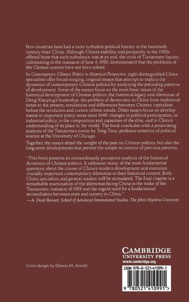 Few countries have had a more turbulent political history in the twentieth century than China. Although China's unprecedented stability and prosperity in the 1980s gave hope that such turbulence was at an end, the crises of Tiananmen, culminating in the massacre of June 4, 1989, proved that the turbulence continues. Here, eight distinguished China specialists provide wide ranging, original essays that attempt to explain the dynamics of contemporary Chinese politics by analysing the preceding patterns of development. Some of the essays focus on the most basic issues of the historical development of Chinese politics while other essays focus on developments in important policy areas since 1949. The book concludes with a penetrating analysis of the Tiananmen events by Tang Tsou, Professor Emeritus of Political Science at the University of Chicago. Together, the essays detail the weight of the past on Chinese politics, but also the long term developments that prevent the simple recurrence of previous patterns.