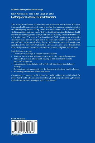 This innovative reference examines how consumer health informatics (CHI) can transform healthcare systems stressed by staffing shortages and budget constraints and challenged by patients taking a more active role in their care. It situates CHI as vital to upgrading healthcare service delivery, detailing the relationship between health information technologies and quality healthcare, and outlining what stakeholders need to learn for health IT systems to function effectively. Wide-ranging content identifies critical issues and answers key questions at the consumer, practitioner, administration, and staff levels, using examples from diverse conditions, countries, technologies, and specialties. In this framework, the benefits of CHI are seen across service domains, from individual patients and consumers to healthcare systems and global health entities.