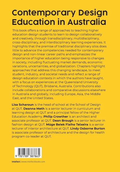 Lisa Scharoun is currently the head of school at the School of Design at Queensland University of Technology in Brisbane, Australia. Deanna Meth is a senior lecturer in curriculum and learning design at the Queensland University of Technology and a principal fellow of the Higher Education Academy. Philip Crowther is an architect and associate professor at the Queensland University of Technology. Dean Brough is a senior lecturer at the Queensland University of Technology Fashion Design. Lindy Osborne Burton is associate professor of architecture and the design for health program co-leader at the Queensland University of Technology. Müge Belek Fialho Teixeira is a senior lecturer in the Faculty of Engineering, Interior Architecture at the Queensland University of Technology.