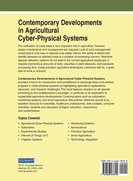 The cultivation of crops plays a very important role in agriculture. However, proper maintenance and management are required. Lack of such management would lead to crop loss or reduced crop yields. Hence, the ability to detect and identify diseases on infected crops is a problem of increasing concern. Real-time disease detection systems do not exist in the current agricultural landscape. It requires tremendous amounts of work, expertise in plant diseases, and excessive processing time. Using precision agriculture techniques, combined with AI, a great deal of work is reduced. Contemporary Developments in Agricultural Cyber-Physical Systems provides a forum for researchers and practitioners to exchange ideas and achieve progress in cyber-physical systems by highlighting agricultural applications, advances, and research challenges. The book features chapters on all aspects pertaining to this multidisciplinary paradigm, in particular in its application to sustainable agriculture developments. Covering topics such as automation, monitoring systems, and smart agriculture, this premier reference source is an excellent resource for scientists, healthcare professionals, data analysts, computer scientists, students and educators of higher education, researchers, and academicians.