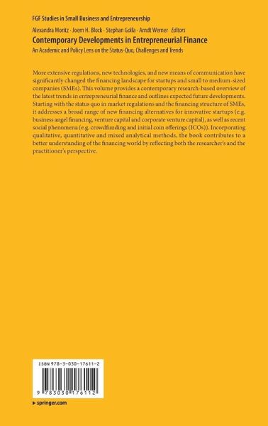 More extensive regulations, new technologies, and new means of communication have significantly changed the financing landscape for startups and small to medium-sized companies (SMEs). This volume provides a contemporary research-based overview of the latest trends in entrepreneurial finance and outlines expected future developments. Starting with the status quo in market regulations and the financing structure of SMEs, it addresses a broad range of new financing alternatives for innovative startups (e.g. business angel financing, venture capital and corporate venture capital), as well as recent social phenomena (e.g. crowdfunding and initial coin offerings (ICOs)). Incorporating qualitative, quantitative and mixed analytical methods, the book contributes to a better understanding of the financing world by reflecting both the researcher's and the practitioner's perspective.