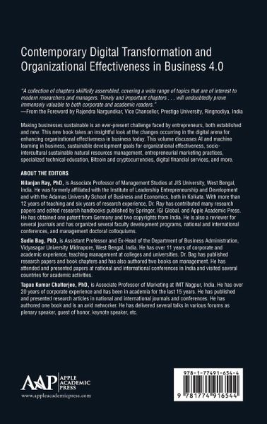 Nilanjan Ray, Phd, is Associate Professor of Management Studies at JIS University, West Bengal, India. He was formerly affiliated with the Institute of Leadership Entrepreneurship and Development and with the Adamas University School of Business and Economics, both in Kolkata. With more than 12 years of teaching and six years of research experience, Dr. Ray has contributed many research papers and edited research handbooks published by Springer, IGI Global, and Apple Academic Press. He has obtained one patent from Germany and two copyrights from India. He is also a reviewer for several journals and has organized several faculty development programs, national and international conferences, and management doctoral colloquiums. Sudin Bag, PhD, is Assistant Professor and Ex-Head of the Department of Business Administration, Vidyasagar University Midnapore, West Bengal, India. He has over 11 years of corporate and academic experience, teaching management at colleges and universities. Dr. Bag has published research papers and book chapters and has also authored two books on management. He has attended and presented papers at national and international conferences in India and visited several countries for academic activities Tapas Kumar Chatterjee, PhD, is Associate Professor of Marketing at IMT Nagpur, India. He has over 20 years of corporate experience and has been in academia for the last 15 years. He has published and presented research articles in national and international journals and conferences. He has authored one book and is an avid networker. He has delivered several talks in various forums as plenary speaker, guest of honor, keynote speaker, etc.