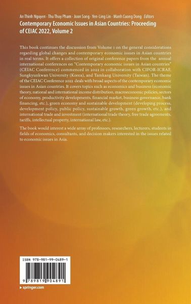 This book continues the discussion from Volume 1 on the general considerations regarding global changes and contemporary economic issues in Asian countries in real terms. It offers a collection of original conference papers from the annual international conferences on "Contemporary economic issues in Asian countries" (CEIAC Conference) commenced in 2022 in collaboration with CIFOR-ICRAF, Sungkyunkwan University (Korea), and Tamkang University (Taiwan). The theme of the CEIAC Conference 2022 deals with broad aspects of the contemporary economic issues in Asian countries. It covers topics such as economics and business (economic theory, national and international income distribution, macroeconomic policies, sectors of economy, productivity developments, financial market, business governance, bank financing, etc.), green economy and sustainable development (developing process, development policy, public policy, sustainable growth, green growth, etc.), and international tradeand investment (international trade theory, free trade agreements, tariffs, intellectual property, international law, etc.).