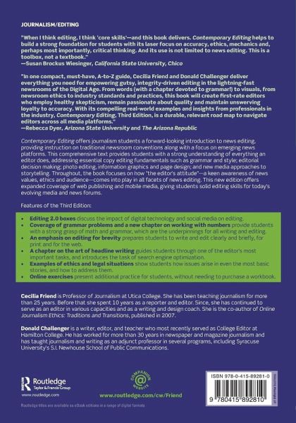 Contemporary Editing offers journalism students a forward-looking introduction to news editing, providing instruction on traditional newsroom conventions along with a focus on emerging news platforms. This comprehensive text provides students with a strong understanding of everything an editor does, addressing essential copy editing fundamentals such as grammar and style; editorial decision making; photo editing, information graphics, and page design; and new media approaches to storytelling. Throughout, the book focuses on how "the editor's attitude"-a keen awareness of news values, ethics, and audience-comes into play in all facets of news editing. This new edition offers expanded coverage of web publishing and mobile media, giving students solid editing skills for today's evolving media and news forums. Features of the Third Edition: -Editing 2.0 boxes discuss the impact of digital technology and social media on editing. -Coverage of grammar problems and a new chapter on working with numbers provide students with a strong grasp of math and grammar, which are the underpinnings for all writing and editing. -An emphasis on editing for brevity prepares students to write and edit clearly and briefly, for print and for the web. -A chapter on the art of headline writing guides students through one of the editor's most important tasks, and introduces the task of search engine optimization. -Examples of ethics and legal situations show students how issues arise in even the most basic stories, and how to address them. -Online exercises present additional practice for students, without needing to purchase a workbook. ¿ ¿