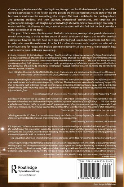 Contemporary Environmental Accounting: Issues, Concepts and Practice has been written by two of the world's leading experts in the field in order to provide the most comprehensive and state-of-the-art textbook on environmental accounting yet attempted. The book is suitable for both undergraduate and graduate students and their teachers, professional accountants, and corporate and organisational managers. Although no prior knowledge of environmental accounting is necessary to understand the critical issues at stake, academic accountants will also find that the book provides a useful introduction to the topic. The goals of the book are to discuss and illustrate contemporary conceptual approaches to environmental accounting; to make readers aware of crucial controversial topics; and to offer practical examples of how the concepts have been applied throughout Europe, North America and Australia. In order to increase the usefulness of the book for relevant courses, each chapter concludes with a set of questions for review. This book is essential reading for all those who are interested in how environmental issues influence accounting.A solutions manual is available on request with the purchase of this book.