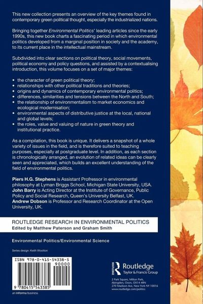 This new collection from the leading journal, Environmental Politics, presents an excellent overview of the key themes found in contemporary green political thought since the early 1990s. Bringing together the journal's major work, this new book charts a fascinating period in which environmental politics developed from a marginal position in society and the academy, to its current place in the intellectual mainstream. Subdivided into clear sections on political theory, social movements, political economy and policy questions, and assisted by a contextualising introduction, this volume focuses on a set of clear themes: the character of green political theory relationships with other political traditions and theories origins and dynamics of contemporary environmental politics differences, similarities and tensions between the North and South the relationship of environmentalism to market economics and ecological modernization environmental aspects of distributive justice at the local, national and global levels the roles, value and valuing of nature in green theory and institutional practice. As a compilation, this book is unique. It delivers a snapshot of a variety of issues in the field, and is therefore ideally suited to teaching purposes, especially at postgraduate level. In addition, as each section is chronologically arranged, an evolution of related ideas can be clearly seen and appreciated, which builds an excellent understanding of the field of environmental politics