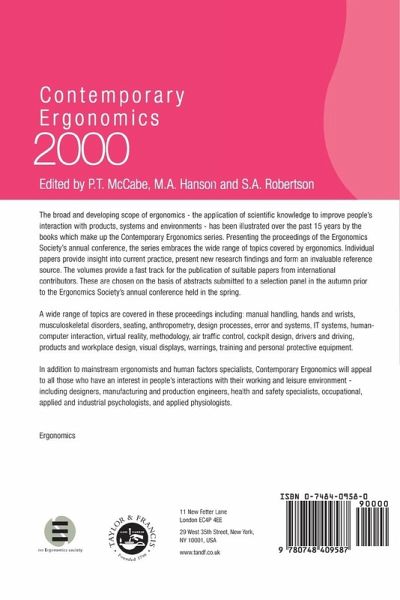 The 2000 edition of this long running and highly respected series, contains the best papers from the Ergonomics Society Annual Conference in 2000. The individual papers provide insight into current practice, presents new research findings, and forms an invaluable reference source. In addition to mainstream ergonomists and human factors specialists, Contemporary Ergonomics 2000 will appeal to all those who have an interest in peoples' interaction with their working and leisure environment - including designers, manufacturing and production engineers, health and safety specialists, occupational, applied and industrial psychologists and applied physiologists.