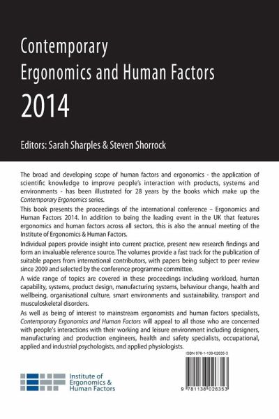 The broad and developing scope of human factors and ergonomics - the application of scientific knowledge to improve people's interaction with products, systems and environments - has been illustrated for 28 years by the books which make up the Contemporary Ergonomics series. This book presents the proceedings of the international conference - Ergonomics and Human Factors 2014. In addition to being the leading event in the UK that features ergonomics and human factors across all sectors, this is also the annual meeting of the Institute of Ergonomics & Human Factors. As well as being of interest to mainstream ergonomists and human factors specialists, Contemporary Ergonomics and Human Factors will appeal to all those who are concerned with people's interactions with their working and leisure environment including designers, manufacturing and production engineers, health and safety specialists, occupational, applied and industrial psychologists, and applied physiologists.
