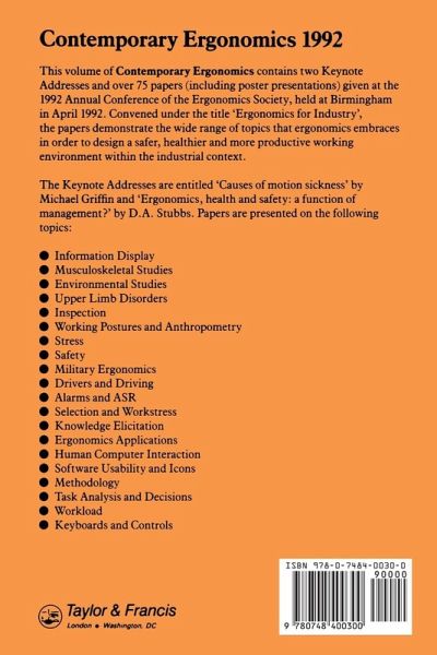 This book is based on the proceedings of the Ergonomics Society's 1992 Annual Conference Birmingham, England, 7-10 April 1992. It contains papers, covering environmental studies, musculoskeletal studies, working postures and anthropometry, safety, and military ergonomics.