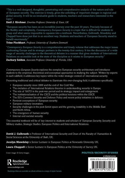 Contemporary European Security explores the complex European security architecture and introduces students to the empirical, theoretical and conceptual approaches to studying the subject. Written by experts in each subfield, it addresses key topics within the wider strategic context of international security.