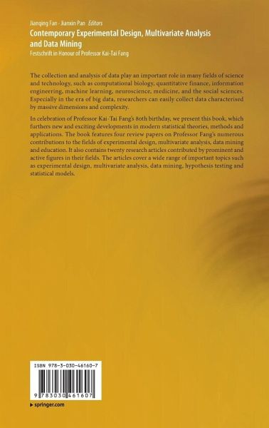 Part I Review of Kai-Tai Fang's Contribution.- 1 Walking on the Road to the Statistical Pyramid.- 2 The contribution to experimental designs by Kai-Tai Fang.- 3 From "Clothing Standard" to "Chemometrics".- 4 A Review of Professor Kai-Tai Fang's Contribution to the Education, Promotion, and Advancement of Statistics in China.- Part II Design of Experiments.- 5 Is a Transformed Low Discrepancy Design Also Low Discrepancy?.- 6 The construction of optimal design for order-of-addition experiment via threshold accepting.- 7 Construction of Uniform Designs on Arbitrary Domains by Inverse Rosenblatt Transformation.- 8 Drug Combination Studies, Uniform Experimental Design and Extensions.- 9 Modified robust design criteria for Poisson mixed models.- 10 Study of Central Composite Design and Orthogonal Array Composite Design.- 11 Uniform design on manifold.- Part III Multivariate Analysis.- 12 An Application of the Theory of Spherical Distributions in Multiple Mean Comparison.- 13 Estimating the Location Vector for Spherically Symmetric Distributions.- 14 On equidistant designs, symmetries and their violations in multivariate models.- 15 Estimation of covariance matrix with ARMA structure through quadratic loss function.- Part IV Data Mining.- 16 Depth Importance in Precision Medicine (DIPM): A Tree and Forest Based Method.- 17 Bayesian Mixture Models with Weight-Dependent Component Priors.- 18 Cosine Similarity-Based Classifiers for Functional Data.- Part V Hypothesis Test and Statistical Models.- 19 Projection Test with Sparse Optimal Direction for High-dimensional One Sample Mean Problem.- 20 Goodness-of-fit tests for correlated bilateral data from multiple groups.- 21 A Bilinear Reduced Rank Model.- 22 Simultaneous multiple change points estimation in generalized linear models.- 23 Data-Based Priors for Bayesian Model Averaging.- 24 Quantile regression with Gaussian kernels.
