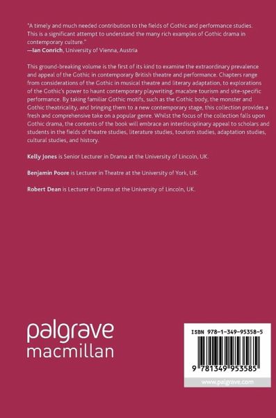 This ground-breaking volume is the first of its kind to examine the extraordinary prevalence and appeal of the Gothic in contemporary British theatre and performance. Chapters range from considerations of the Gothic in musical theatre and literary adaptation, to explorations of the Gothic's power to haunt contemporary playwriting, macabre tourism and site-specific performance. By taking familiar Gothic motifs, such as the Gothic body, the monster and Gothic theatricality, and bringing them to a new contemporary stage, this collection provides a fresh and comprehensive take on a popular genre. Whilst the focus of the collection falls upon Gothic drama, the contents of the book will embrace an interdisciplinary appeal to scholars and students in the fields of theatre studies, literature studies, tourism studies, adaptation studies, cultural studies, and history.