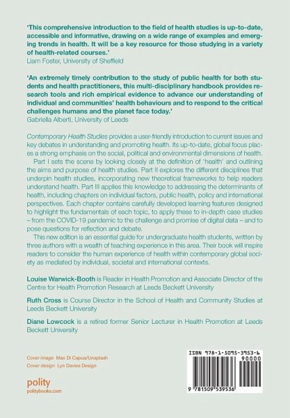 Part One sets the scene by looking closely at the definition of 'health' and outlining the aims and purpose of health studies. Part Two explores the different disciplines that underpin health studies, such as sociology, psychology, anthropology and health psychology, incorporating new theoretical frameworks to help readers understand health. Part Three applies this knowledge to address the determinants of health, including chapters on individual factors, the role of public health, the latest policy influences on health and the growing importance of the global context. Each chapter contains contemporary statistics and evidence alongside carefully developed learning features designed to highlight the fundamentals of each topic, to apply these to in-depth case studies - from global antibiotic resistance to the challenge and promise of digital data -, and to pose questions for reflection and debate. Contemporary Health Studies is an essential guide for undergraduate health students written by three authors who have a wealth of teaching experience in this subject area. Their book will inspire readers to consider the human experience of health within contemporary global society as it is mediated by individual, societal and global contexts.