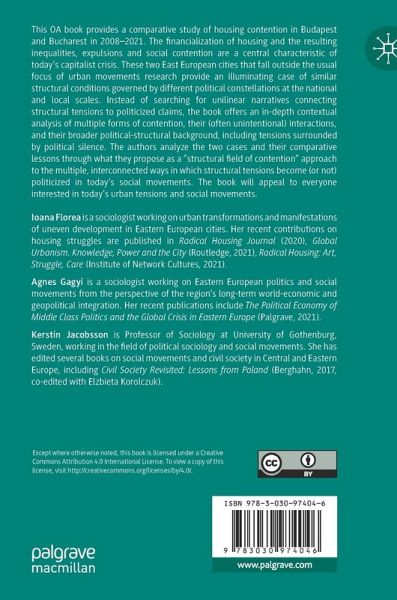 This OA book provides a comparative study of housing contention in Budapest and Bucharest in 2008-2021. The financialization of housing and the resulting inequalities, expulsions and social contention are a central characteristic of today's capitalist crisis. These two East European cities that fall outside the usual focus of urban movements research provide an illuminating case of similar structural conditions governed by different political constellations at the national and local scales. Instead of searching for unilinear narratives connecting structural tensions to politicized claims, the book offers an in-depth contextual analysis of multiple forms of contention, their (often unintentional) interactions, and their broader political-structural background, including tensions surrounded by political silence. The authors analyze the two cases and their comparative lessons through what they propose as a "structural field of contention" approach to the multiple, interconnectedways in which structural tensions become (or not) politicized in today's social movements. The book will appeal to everyone interested in today's urban tensions and social movements.