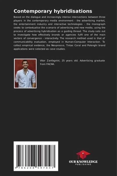 Based on the dialogue and increasingly intense intersections between three players in the contemporary media environment - the advertising market, the entertainment industry and interactive technologies - the monograph seeks to contextualise the scenario of advertising and new media, using the process of advertising hybridisation as a guiding thread. The study sets out to investigate how effectively brands or agencies fulfil one of the main vectors of convergence - interactivity. The research method used is that of communicability evaluation, employed in Human-Computer Interaction. To collect empirical evidence, the Nespresso, Tintas Coral and Polenghi brand applications were selected as case studies.