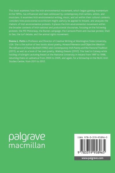 This book examines how the Irish environmental movement, which began gaining momentum in the 1970s, has influenced and been addressed by contemporary Irish writers, artists, and musicians. It examines Irish environmental writing, music, and art within their cultural contexts, considers how postcolonial ecocriticism might usefully be applied to Ireland, and analyzes the rhetoric of Irish environmental protests. It places the Irish environmental movement within the broader contexts of Irish national and postcolonial discourses, focusing on the following protests: the M3 Motorway, the Burren campaign, the Carnsore Point anti-nuclear protest, Shell to Sea, the turf debate, and the animal rights movement.