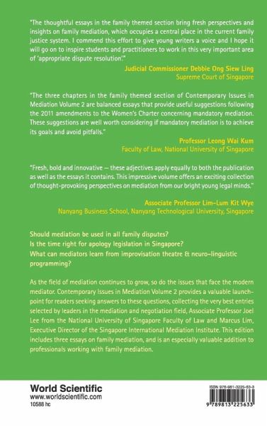 Should mediation be used in all family disputes? Is the time right for apology legislation in Singapore? What can mediators learn from improvisation theatre & neuro-linguistic programming? As the field of mediation continues to grow, so do the issues that face the modern mediator. Contemporary Issues in Mediation-Volume 2 provides a valuable launch-point for readers seeking answers to these questions, collecting the very best entries selected by leaders in the mediation and negotiation field — Prof. Joel Lee (National University of Singapore) and Marcus Lim (Singapore International Mediation Institute). This edition includes three essays on family mediation, and is an especially valuable addition to professionals working with family mediation.
