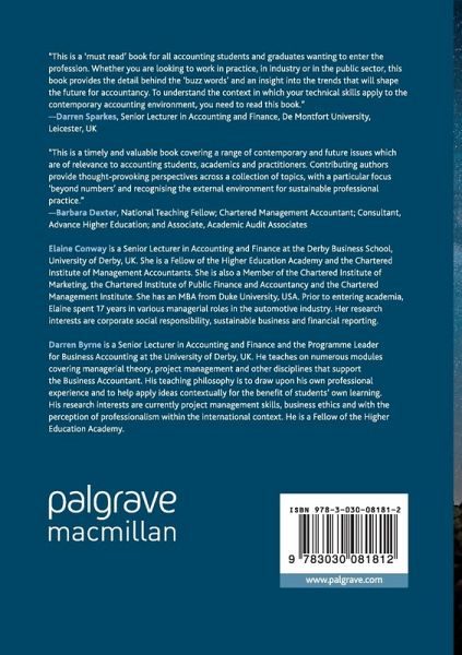Chapter 1. Contemporary Issues in Accounting - An Introduction; Darren Byrne.- Chapter 2. Sustainability, the Triple Bottom Line and Corporate Social Responsibility; Elaine Conway.- Chapter 3. The Challenges of the Circular Economy; Simon Peter Nadeem, Jose Arturo Garza-Reyes and Denise Glanville.- Chapter 4. Technology Challenges in Accounting and Finance; Liz Crookes and Elaine Conway.- Chapter 5. The Contemporary Corporate Tax Strategy Environment; Juliet Hogsden.- Chapter 6. Corporate Reporting: From Numbers to Narrative; Parminder Johal.- Chapter 7. Contemporary Challenges in Audit; David Thompson.- Chapter 8. Why Do We Need To Measure Performance? A Local Government Perspective; Hilary Coyle.- Chapter 9. Finance and Accounting - Beyond the Numbers with Self-Leadership; Darren Byrne and Dave Lees.- Chapter 10. The Future of Accountancy - Beyond the Numbers; Elaine Conway.
