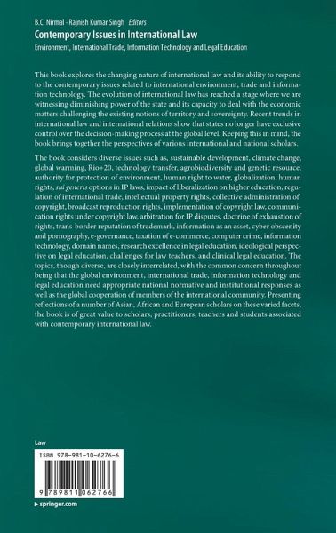 This book explores the changing nature of international law and its ability to respond to the contemporary issues related to international environment, trade and information technology. The evolution of international law has reached a stage where we are witnessing diminishing power of the state and its capacity to deal with the economic matters challenging the existing notions of territory and sovereignty. Recent trends in international law and international relations show that states no longer have exclusive control over the decision-making process at the global level. Keeping this in mind, the book brings together the perspectives of various international and national scholars. The book considers diverse issues such as, sustainable development, climate change, global warming, Rio+20, technology transfer, agro-biodiversity and genetic resource, authority for protection of environment, human right to water, globalization, human rights, sui generis options in IP laws, impact of liberalization on higher education, regulation of international trade, intellectual property rights, collective administration of copyright, broadcast reproduction rights, implementation of copyright law, communication rights under copyright law, arbitration for IP disputes, doctrine of exhaustion of rights, trans-border reputation of trademark, information as an asset, cyber obscenity and pornography, e-governance, taxation of e-commerce, computer crime, information technology, domain names, research excellence in legal education, ideological perspective on legal education, challenges for law teachers, and clinical legal education. The topics, though diverse, are closely interrelated, with the common concern throughout being that the global environment, international trade, information technology and legal education need appropriate national normative and institutional responses as well as the global cooperation of members of the international community. Presenting reflections of a number of Asian, African and European scholars on these varied facets, the book is of great value to scholars, practitioners, teachers and students associated with contemporary international law.
