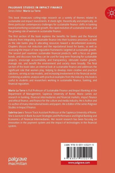 The first section of the book explores the benefits for banks and the financial industry from integrating sustainable finance into their business processes, as well as the role banks play in allocating resources towards a decarbonized economy. Chapters discuss risk reduction and the reputational boost for banks, as well as assessing the impact of new regulation frameworks targeted at sustainable growth. The second part examines sustainable financial products, with a focus on green bonds, and discusses how they can be used for long-term financing for sustainable projects, encourage accountability andtransparency, stimulate market growth, manage risk, and benefit the environment and society more broadly. The final section of the book takes an internal look at sustainable finance and addresses the significant role that women play, helping to develop more creative and practical solutions, serving as role models, and increasing involvement in the financial sector. Combining academic analysis with practical examples from the industry, this book will be useful to students and researchers working in sustainable finance, banking, and financial regulation.