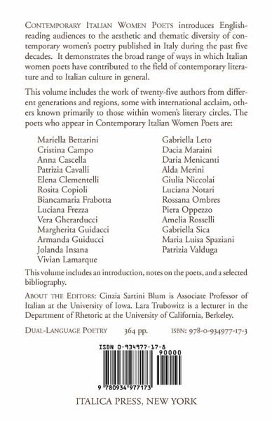 Contemporary Italian Women Poets introduces English-reading audiences to the diversity of contemporary women's poetry in Italy during the past five decades. It includes twenty-five authors whose work has been published since World War II: poets from different generations and regions, some with international acclaim, others known primarily to those within women's literary circles. THE POETS who appear are: Mariella Bettarini, Cristina Campo, Anna Cascella, Patrizia Cavalli, Elena Clementelli, Rosita Copioli,Biancamaria Frabotta, Luciana Frezza, Vera Gherarducci, Margherita Guidacci, Armanda Guiducci, Jolanda Insana, Vivian Lamarque, Gabriella Leto, Dacia Maraini, Daria Menicanti, Alda Merini, Giulia Niccolai, Luciana Notari, Rossana Ombres, Piera Oppezzo, Amelia Rosselli, Gabriella Sica, Maria Luisa Spaziani and Patrizia Valduga. DUAL-LANGUAGE POETRY. Introduction, notes on the poets, bibliography & index of first lines.