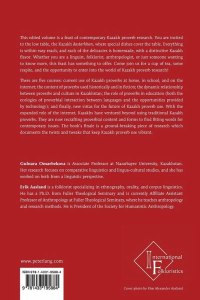 This edited volume is a feast of contemporary Kazakh proverb research. You are invited to the low table, the Kazakh dastarkhan, where special dishes cover the table. Everything is within easy reach, and each of the delicacies is homemade, with a distinctive Kazakh flavor. Whether you are a linguist, folklorist, anthropologist, or just someone wanting to know more, this feast has something to offer. Come join us for a cup of tea, some respite, and the opportunity to enter into the world of Kazakh proverb research!