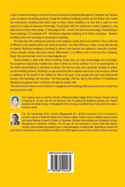In age of modern technology environment the book Contemporary Marketing Management: Strategies and Practices covers all aspects of marketing practices. Though the traditional marketing practices are still vibrant in the market, the contemporary marketing holds better scope in future. Online marketing is an area that is ready for more expansion of usage and extension of technology. The paradigm shift from traditional to modern marketing is a key factor based on three shifts namely, (i) Technological shift - Growth from old to new technology, (Telemarketing to Email marketing), (ii) Conceptual shift - Marketing to Integrated marketing, & (iii) Techno-conceptual - database marketing which uses technology to conceptualize marketing. This book deals with contemporary practices in two categories namely ethical and unethical. There is a thin line of difference while detailing ethical and unethical practices. The subtle difference is often crossed with the help of creativity. Multi level marketing is considered as ethical in few countries and unethical in some other countries. Certain concepts overlap, and where staunch differentiation is so difficult such as Viral and Buzz marketing, though the same has been used in an interchangeable way. Neuromarketing is dealt under ethical marketing, though there are many disadvantages over advantages, like acceptance of genetically modified food, which is ethical as well as unethical. As it is an upcoming field, at the interim neuromarketing is considered as ethical. This book has been more specifically designed to address current marketing practices. Marketing is an age old practice that is adopted consciously or unconsciously, defined or undefined, for the benefit of the marketer as well as the buyer. It has evolved over years and enhanced the business with technology and innovation. The three paradigm shift has lead to the evolution of Contemporary Marketing management which is futuristic and ready for another shift. The book will be of immense use to students of management and marketing professionals who want to understand and improve their skills.