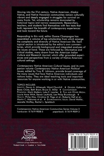 While Native American communities remain culturally innovative and continue to struggle for survival, researchers, teachers, and students lack texts that both represent the breadth of contemporary experiences and look toward the future. Editor Duane Champagne has assembled a volume of top scholarship reflecting the complexity and diversity of Native American cultural life. Section introductions provide background and analyses of the issues. Informative and critical studies offer experiences and perspectives from a variety of Native settings. This book and its companion volume, Contemporary Native American Political Issues, edited by Troy R. Johnson, are ideal teaching tools and resources for anyone working in or with Native communities.