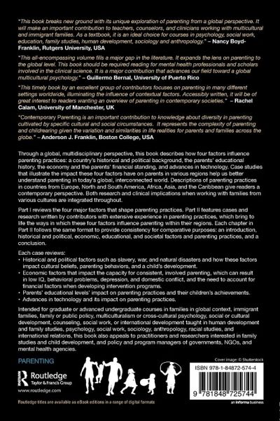 Through a global, multidisciplinary perspective, this book describes how four factors influence parenting practices: a countries historical and political background, the parent's educational history, the economy and the parent's financial standing, and advances in technology. Part 1 reviews each of these factors in detail. Part 2 features cases that illustrate the impact these factors have on parenting practices around the world including Europe, the Americas, Africa, Asia, and the Caribbean. Research and clinical implications when working with families from various cultures are integrated throughout. Chapters follow the same format to provide consistency for comparative purposes.