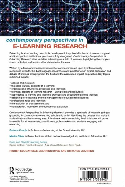 E-learning is at an exciting point in its development; its potential in terms of research is great and its impact on institutional practices is fully recognised. This book defines e-learning as a field of research, highlighting the complex issues, activities and tensions that characterise the area. Written by a team of experienced researchers and commented upon by internationally recognised experts, this book engages researchers and practitioners in critical discussion and debate about the findings emerging from the field and the associated impact on practice. Key topics examined include: access and inclusion the social-cultural contexts of e-learning organisational structures, processes and identities technical aspects of learning research - using tools and resources approaches to learning and teaching practices and associated learning theories designing for e-learning and the management of educational resources professional roles and identities the evolution of e-assessment collaboration, motivation and educational evaluation. Contemporary Perspectives in E-Learning Research provides a synthesis of research, giving readers a grounding in contemporary e-learning scholarship whilst identifying the debates that make it such a lively and fast-moving area. A landmark text in an evolving field, this book will prove invaluable for all researchers, practitioners, policy makers and students who engage with e-learning.