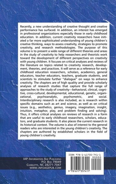 Recently, a new understanding of creative thought and creative performance has surfaced. In addition, an interest has emerged in professional organizations especially those in early childhood education. In addition, current creativity researchers have initiated a far more sophisticated understanding of young children's creative thinking, ways to assess creativity, strategies to promote creativity, and research methodologies. The purpose of this volume is to present a wide range of different theories and areas in the study of creativity to help researchers and theorists work toward the development of different perspectives on creativity with young children. It focuses on critical analyses and reviews of the literature on topics related to creativity research, development, theories, and practices. It will serve as a reference for early childhood education researchers, scholars, academics, general educators, teacher educators, teachers, graduate students, and scientists to stimulate further "dialogue" on ways to enhance creativity. The chapters are of high quality and provide scholarly analyses of research studies that capture the full range of approaches to the study of creativity --- behavioral, clinical, cognitive, cross-cultural, developmental, educational, genetic, organizational, psychoanalytic, psychometric, and social. Interdisciplinary research is also included, as is research within specific domains such as art and science, as well as on critical issues (e.g., aesthetics, genius, imagery, imagination, insight, intuition, metaphor, play, problem finding and solving). Thus, it offers critical analyses on reviews of research in a form that are useful to early childhood researchers, scholars, educators, and graduate students. It also places the current research in its historical context. The volume is also of interest to the general readers who are interested in the young children's creativity. The chapters are authored by established scholars in the field of young children's creativity.