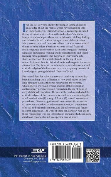 A volume in Contemporary Perspectives in Early Childhood Education Series Editor Olivia N. Saracho, University of Maryland Over the last 35 years, studies focusing in young children's knowledge about the mental world have developed into an important area. This body of social knowledge is called theory of mind, which refers to the individuals' ability to interpret and anticipate the other individuals' thinking, feeling, and behavior based on their interpretation of the situation. Many researchers and theorists believe that a representational theory of mind offers a basis for various critical facets of social-cognitive performance, such as teaching and learning, lying and pretending, making and keeping friends, and social learning more generally. The purpose of this volume is to share a collection of research strands on theory of mind research. It describes its historical roots and suggests improved alternatives. The focus of the volume is to provide a review and critical analysis of the literature on a contemporary domain of knowledge on young children's Theory of Mind. For several decades scholarly research on theory of mind has been flourishing and a collection of new publication outlets have emerged such as the ones reviewed in the volume, which offers a thorough critical analysis of the research in contemporary perspectives on research in theory of mind in early childhood education. The researchers who conducted the critical analyses of the reseearch focused on understanding the mind in relation to (1) young children, (2) several assessment procedures, (3) metacognitive and neuroscientific processes, (3) emotion and educational representations, (4) interaction of social and cultural elements, and (5) inferences and future research directions. The work of these scholars can help guide those researchers who are interested in pursuing studies in early childhood theory of mind in a specific area of study.