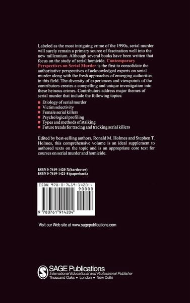PART ONE: WHAT IS SERIAL MURDER? THE CHARACTER AND THE EXTENT Profiles in Terror - R Holmes and J DeBurger The Serial Murderer African-Americans and Serial Homicide - P Jenkins The Female Serial Killer - R Hale and A Bolin Female Serial Murderesses - S Holmes, E Hickey and R Holmes The Unnoticed Terror PART TWO: THE MIND OF THE SERIAL KILLER Introduction The Application of Learning Theory to Serial Murder or `You Too Can Learn to Be a Serial Killer - R Hale The Divided Self - A Carlisle Toward an Understanding of the Dark Side of the Serial Killer Sequential Predation - R Holmes Elements of Serial Fatal Victimization Inside the Mind of the Serial Killer - R Holmes, J DeBurger and S Holmes A Serial Killer s Perspective - Anonymous PART THREE: INVESTIGATING SERIAL MURDER CASES Stalking in America - R Holmes Types and Methods of Criminal Stalkers Profiling the Clairemont Serial Murder Case - J Davis A Collaborative Investigative Effort Psychological Profiling - R Holmes Uses in Serial Murder Cases Cold Case Squad - D Rivers PART FOUR: FUTURE TRENDS IN SERIAL MURDER INVESTIGATION AND RESEARCH Introduction A Methodological Model - K Rossmo Serial Murder Investigation - T O Reilly-Fleming Prospects for Police Networking Selected Problems in Serial Murder Investigations - R Holmes and S Holmes