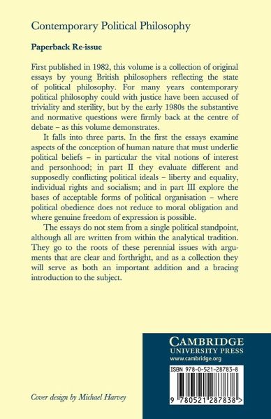 First published in 1982, this volume is a collection of original essays by young British philosophers reflecting the state of political philosophy. For many years contemporary political philosophy could with justice have been accused of triviality and sterility, but by the early 1980s the substantive and normative questions were firmly back at the centre of debate - as this volume demonstrates. It falls into three parts. In the first the essays examine aspects of the conception of human nature that must underlie political beliefs - in particular the vital notions of interest and personhood; in part II they evaluate different and supposedly conflicting political ideals - liberty and equality, individual rights and socialism; and in part III explore the bases of acceptable forms of political organisation - where political obedience does not reduce to moral obligation and where genuine freedom of expression is possible. The essays do not stem from a single political standpoint, although all are written from within the analytical tradition. They go to the roots of these perennial issues with arguments that are clear and forthright, and as a collection they will serve as both an important addition and a bracing introduction to the subject.