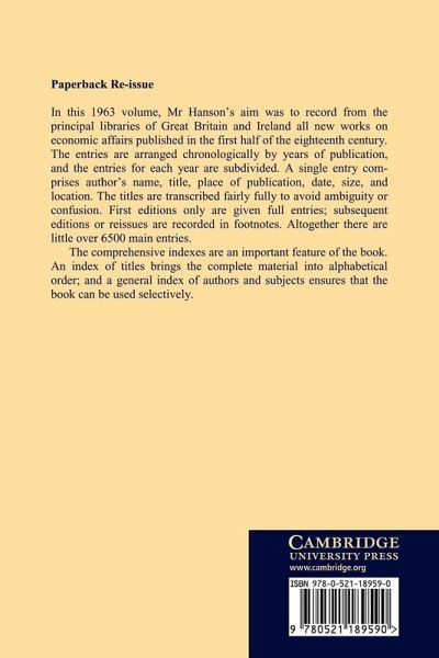 In this 1963 volume, Mr Hanson's aim was to record from the principal libraries of Great Britain and Ireland all new works on economic affairs published in the first half of the eighteenth century. The entries are arranged chronologically by years of publication, and the entries for each year are subdivided. A single entry comprises author's name, title, place of publication, date, size, and location. The titles are transcribed fairly fully to avoid ambiguity or confusion. First editions only are given full entries; subsequent editions or reissues are recorded in footnotes. Altogether there are little over 6500 main entries. The comprehensive indexes are an important feature of the book. An index of titles brings the complete material into alphabetical order; and a general index of authors and subjects ensures that the book can be used selectively.