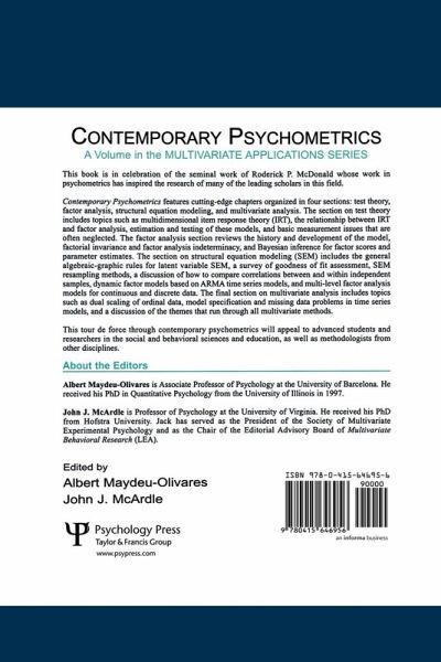Contemporary Psychometrics features cutting edge chapters organized in four sections: test theory, factor analysis, structural equation modeling, and multivariate analysis. The section on test theory includes topics such as multidimensional item response theory (IRT), the relationship between IRT and factor analysis, estimation and testing of these models, and basic measurement issues that are often neglected. The factor analysis section reviews the history and development of the model, factorial invariance and factor analysis indeterminacy, and Bayesian inference for factor scores and parameter estimates. The section on structural equation modeling (SEM) includes the general algebraic-graphic rules for latent variable SEM, a survey of goodness of fit assessment, SEM resampling methods, a discussion of how to compare correlations between and within independent samples, dynamic factor models based on ARMA time series models, and multi-level factor analysis models for continuous and discrete data. The final section on multivariate analysis includes topics such as dual scaling of ordinal data, model specification and missing data problems in time series models, and a discussion of the themes that run through all multivariate methods. This tour de force through contemporary psychometrics will appeal to advanced students and researchers in the social and behavioral sciences and education, as well as methodologists from other disciplines.